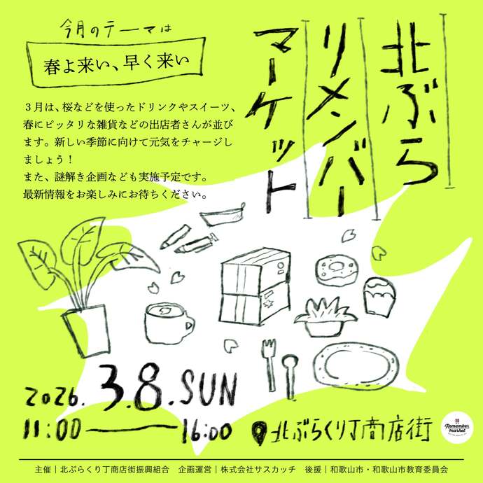 今月のテーマは、春よ来い、早く来い☆3月は、桜などを使ったドリンクやスイーツ、春にピッタリな雑貨などの出店者さんが並びます。新しい季節に向けて元気をチャージしましょう!